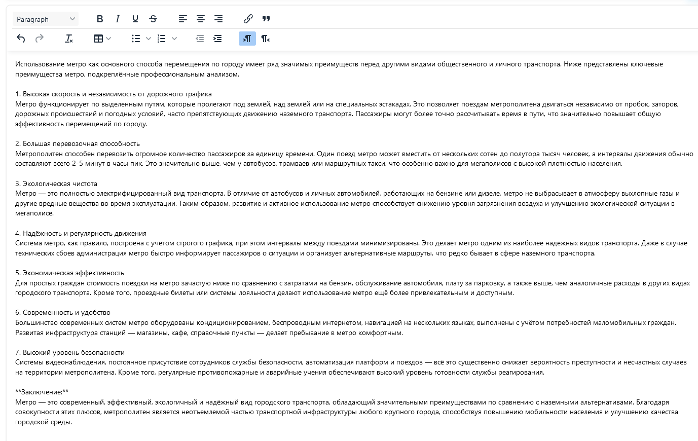 Метро — это современный, эффективный, экологичный и надёжный вид городского транспорта, обладающий значительными преимуществами по сравнению с наземными альтернативами. Благодаря совокупности этих плюсов, метрополитен является неотъемлемой частью транспортной инфраструктуры любого крупного города, способствуя повышению мобильности населения и улучшению качества городской среды.